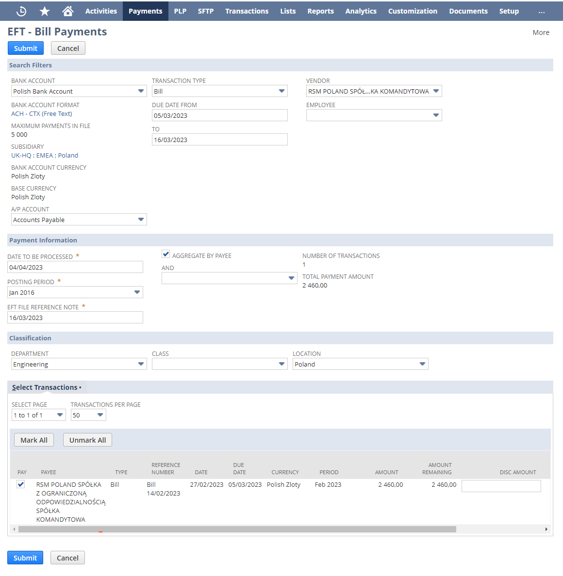 Es bringt Online-Banking-Funktion in NetSuite, die Zahlungen per Überweisung (EFT), Kundenrückerstattungen und Kundenzahlungen (Lastschriften) sowie Betrugsprävention durch den von führenden Banken angebotenen Positive Pay-Service umfassen. Dieses Modul ermöglicht es NetSuite-Benutzern, Bankzahlungen, Mitarbeiterspesen, Partner- und Mitarbeiter-Provisionen und Kundenrückerstattungen zu verarbeiten sowie Bankzahlungen von Kunden zu erhalten.