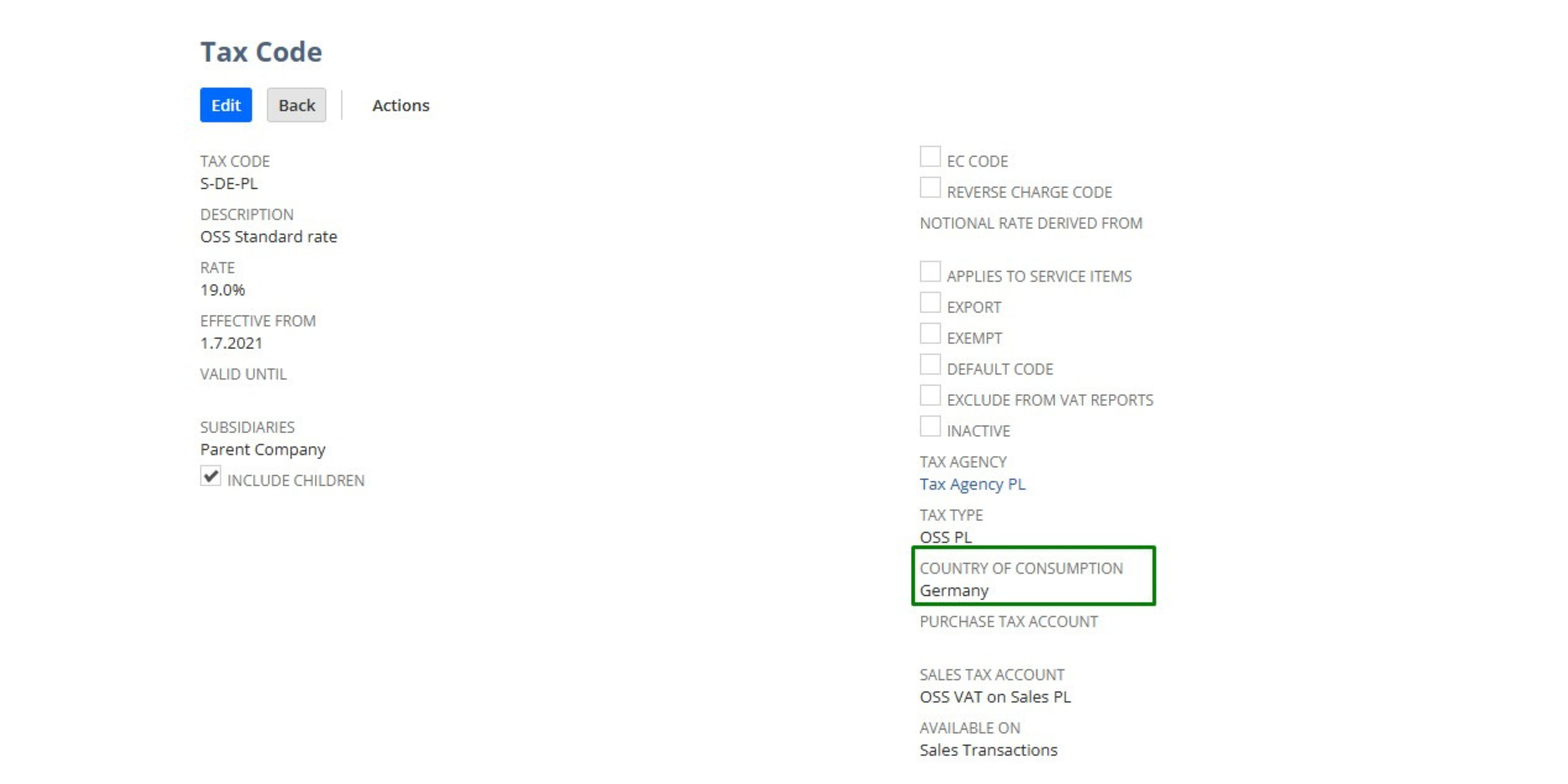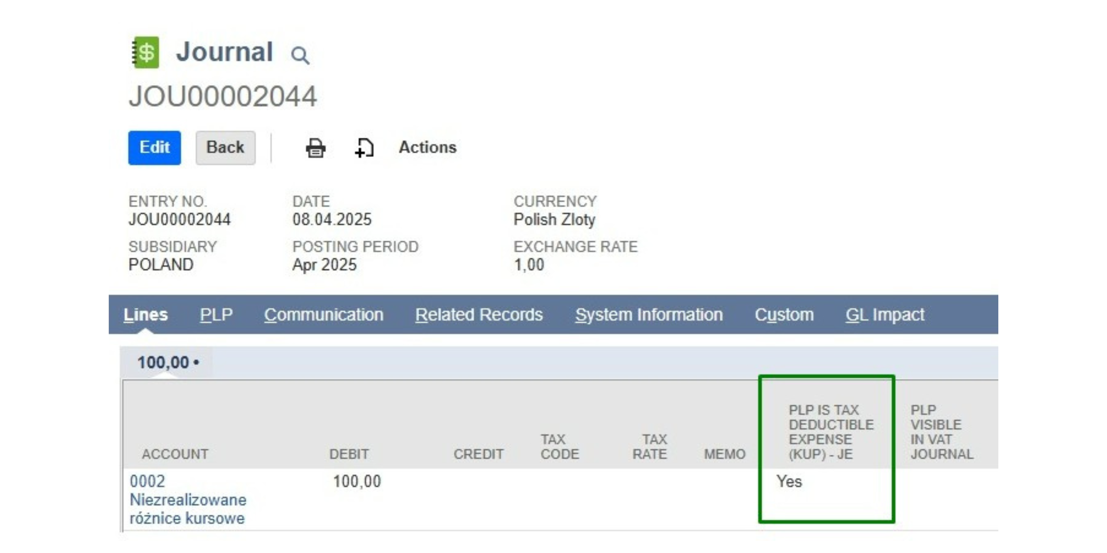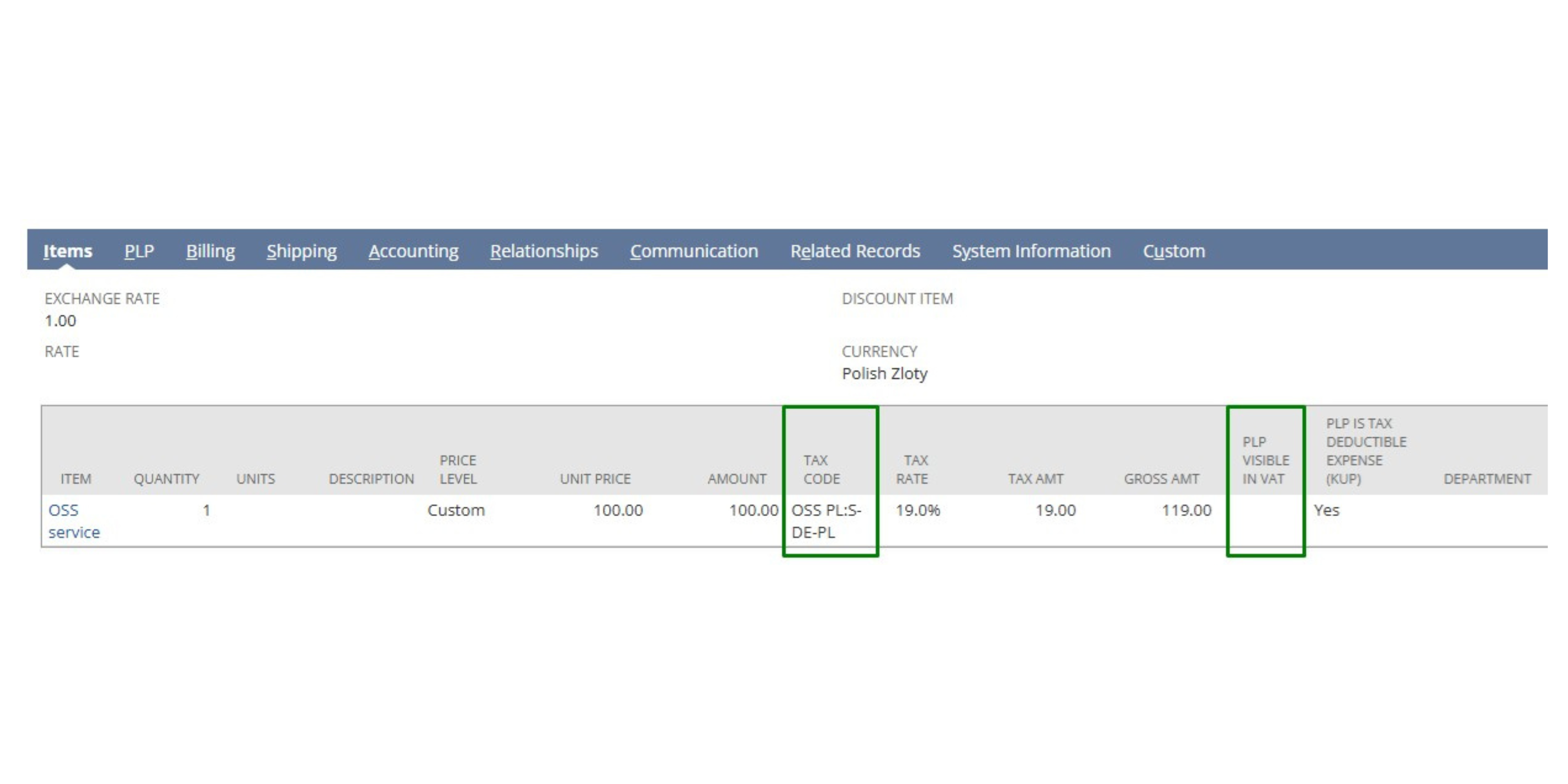 We have expanded the existing automation of the field on the document line "PLP Visible in VAT" in the scope of handling OSS transactions. The new version of the PLP package enables verification whether a given NetSuite environment has the EU One Stop Shop (OSS) functionality activated for the Polish branch and automatically deselects the value "PLP Visible in VAT" for document lines on which a tax code dedicated to OSS transactions has been applied. Such codes are characterised by a filled value in the "Country of Consumption" field.