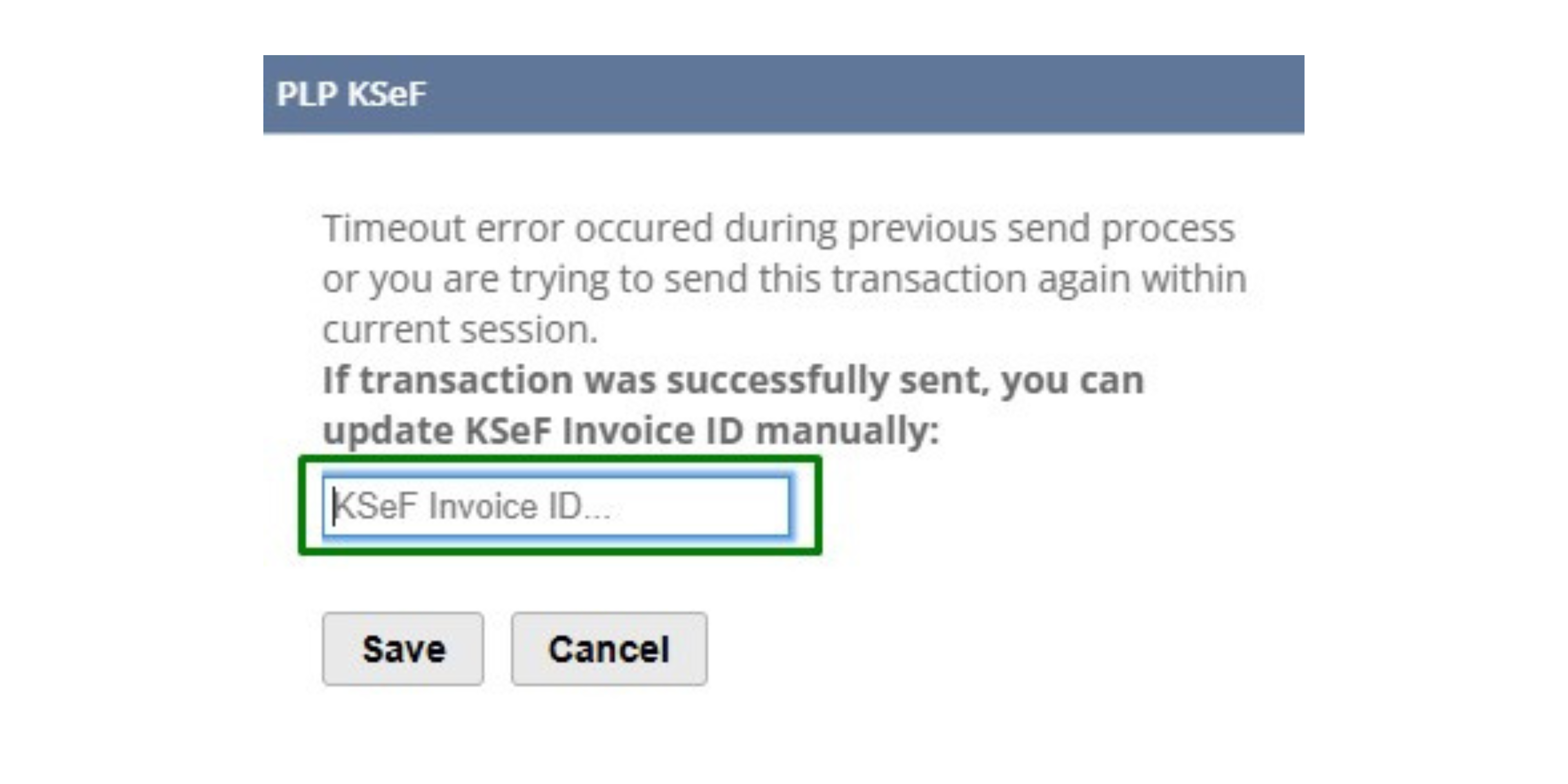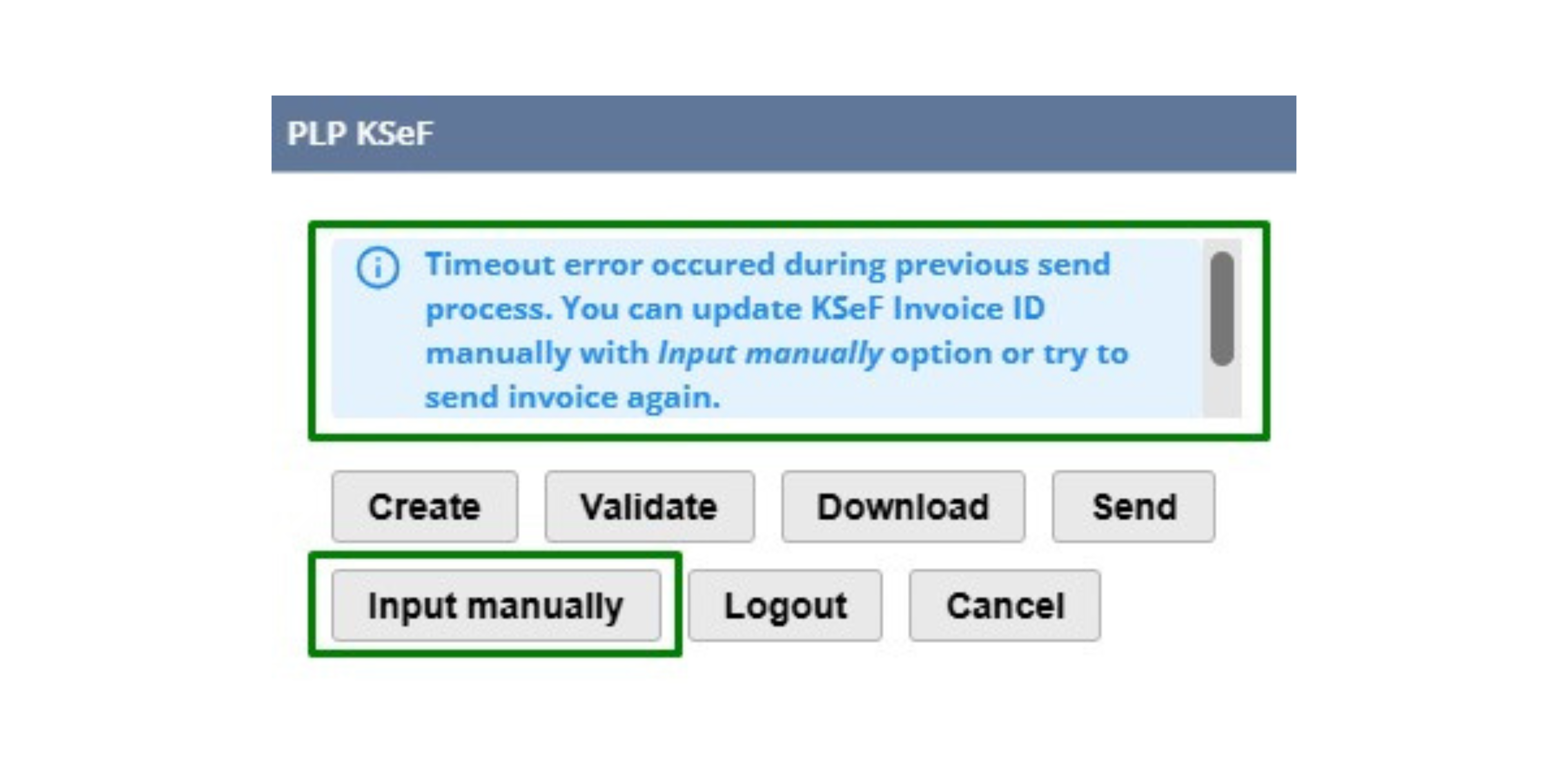 We have introduced additional security measures in the event of exceeding the server response time when sending documents to the KSeF system. Documents that do not receive a response from the KSeF system within the expected time due to a so-called timeout are marked with an additional flag. Using the PLP KSeF button on such a document results in a warning for the user and an additional option "Input manually" being displayed. This allows for manual entry of the document number assigned by the KSeF system.