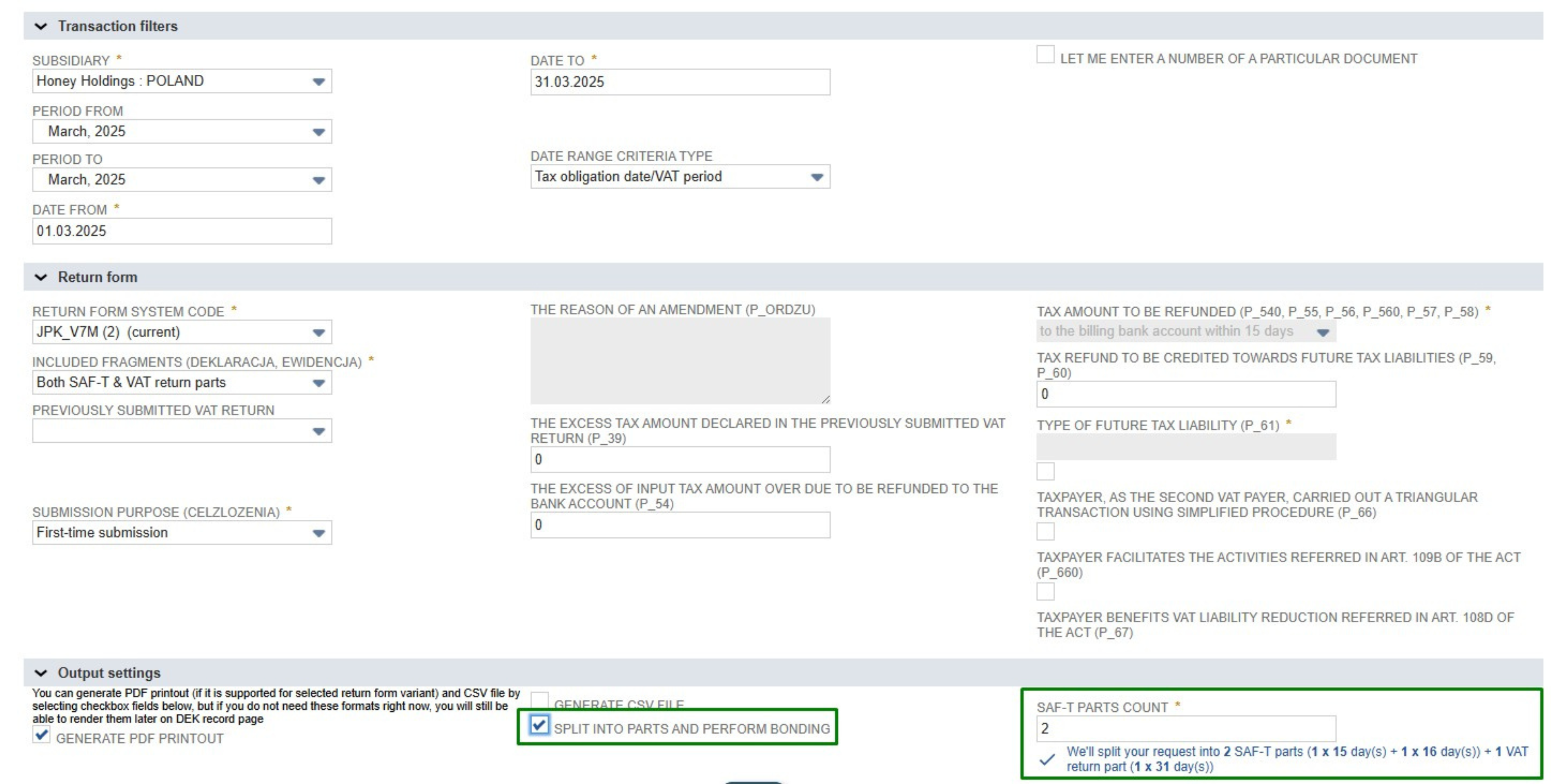 In the All VAT returns and SAFs module, when generating JPK_V7M declarations, a dedicated parameter has been added: "Split into parts and perform bonding". Selecting it results in the appearance of an additional field "SAF-T parts count", allowing you to indicate the number of parts into which the declaration data should be divided. After entering the value, information about the target number of generated files and the range of dates that will cover individual files will be presented.