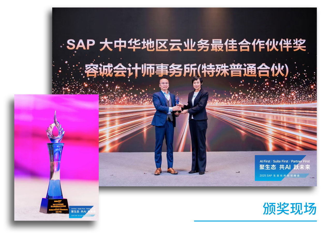 2025年11月19日,在25年SAP中国生态伙伴大会,SAP大中华地区总裁 原欣(Bessie Yuan)向部分合作伙伴颁发“大中华地区云业务最佳合作伙伴奖”。容诚是今年中国内地唯一获此奖项的企业,彰显了其在助力企业云转型和智能化升级方面的卓越能力。