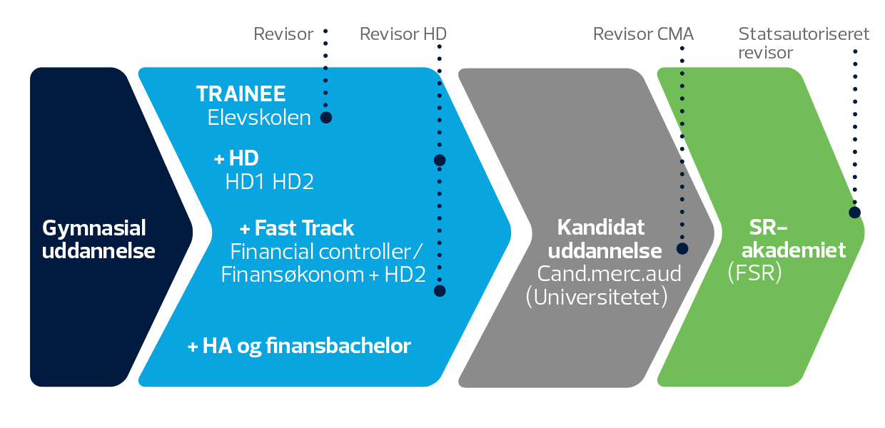 De fleste medarbejdere læser HD, hvorefter nogle ønsker at fortsætte med cand.merc.aud.-studiet. Efter kandidatuddannelsen planlægges det videre karriereforløb, herunder hvorvidt og hvornår man fortsætter via SR Akademiet for derigennem at blive statsautoriseret revisor.