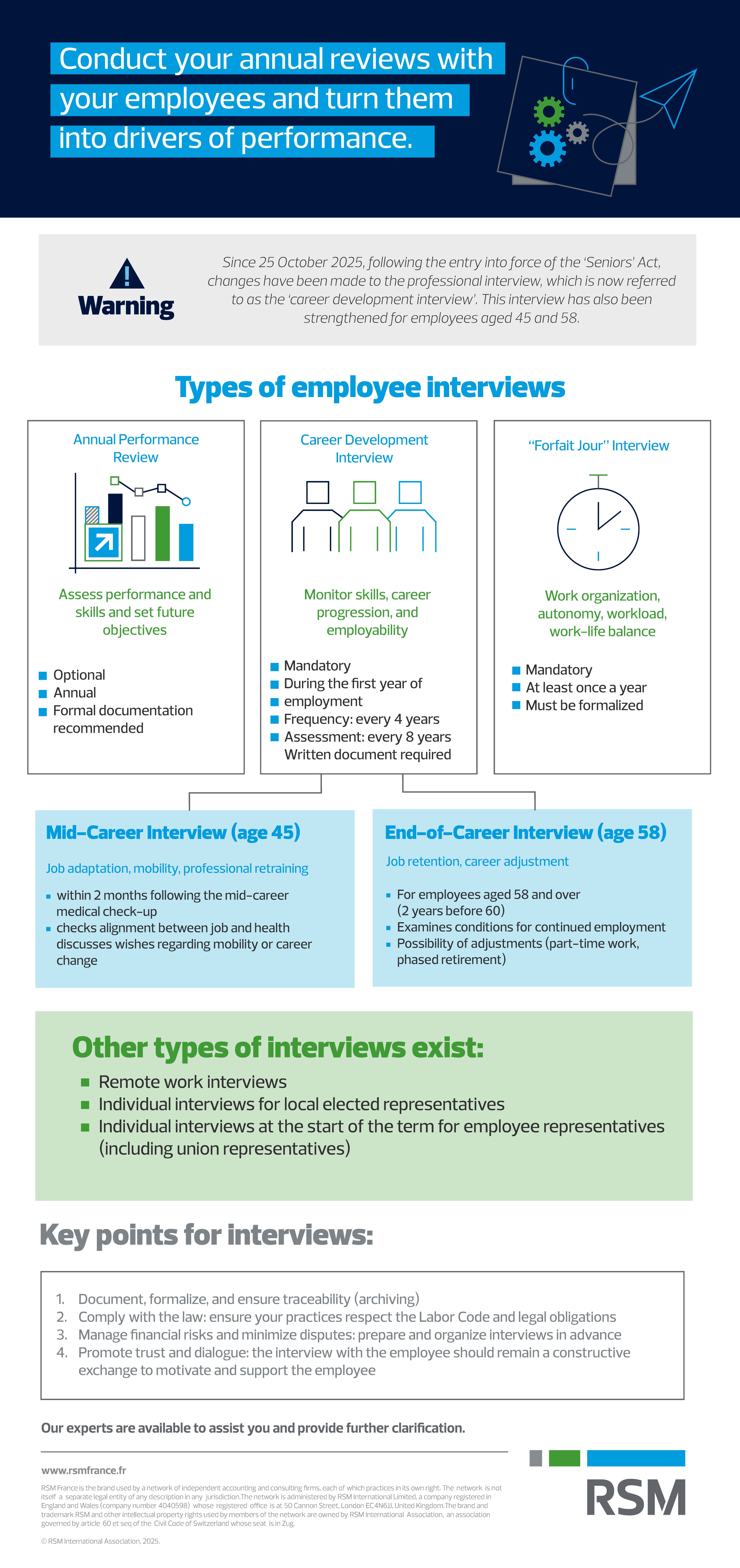 This year, the entry into force of the “Seniors Act” (Act No. 2025-989 of 24 October 2025, published in the Official Journal on 25 October) is reshuffling the deck by reforming the professional interview (mandatory in all companies), now renamed the “career development interview” for all employees. This interview is strengthened for employees aged 45 and adjusted for those aged 58 and over.