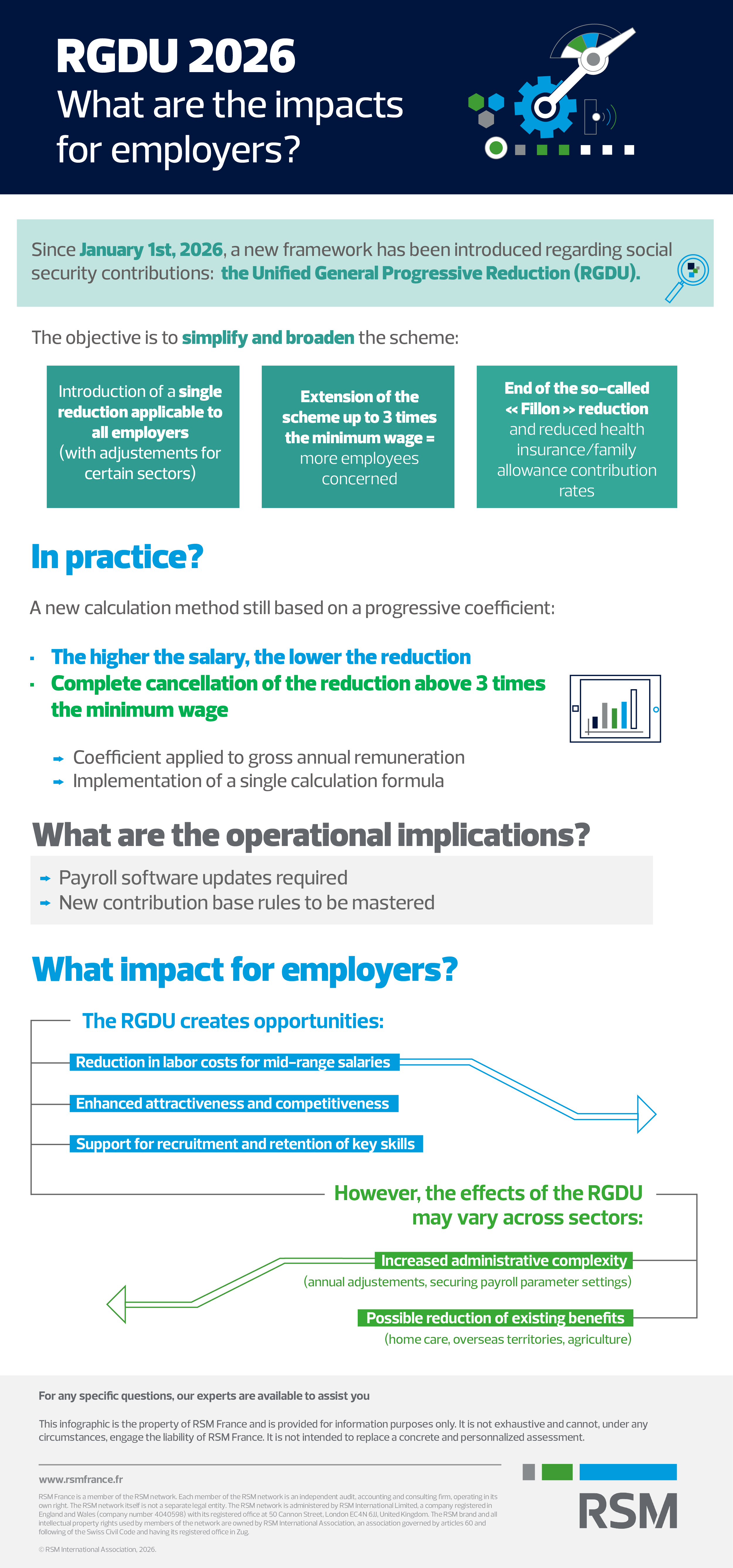 Presented as a simplification reform, the RGDU significantly broadens eligibility, as the reduction will now apply to salaries of up to three times the statutory minimum wage (SMIC). While the reform aims to enhance clarity and consistency, its effects will vary across sectors and pay levels.
