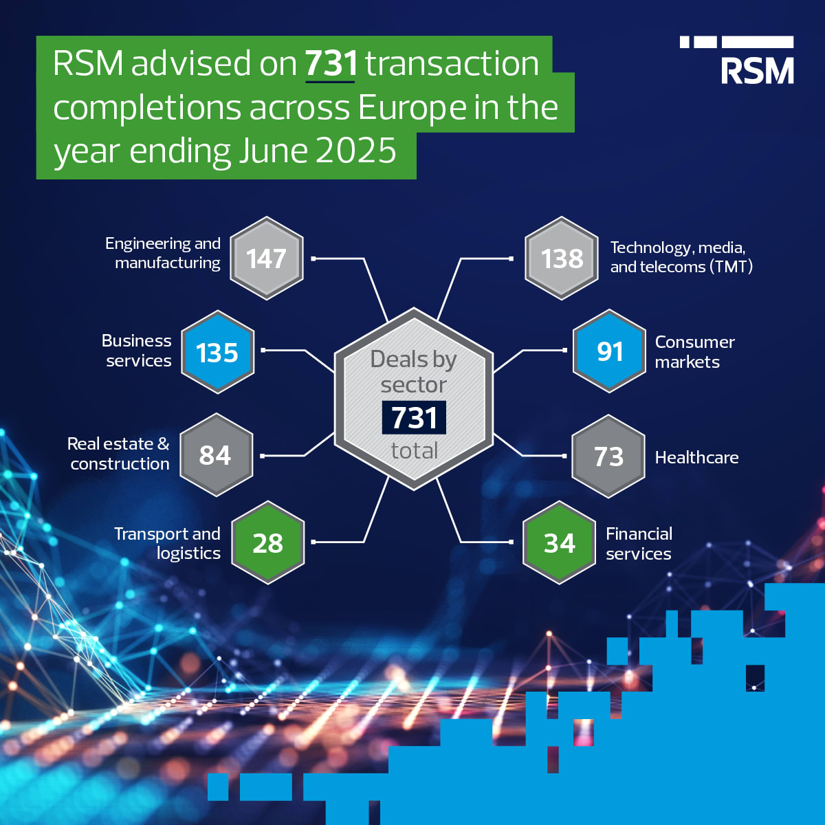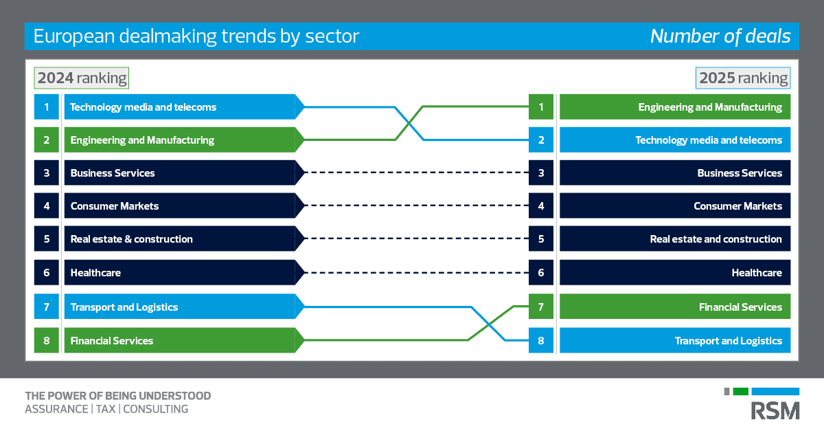 Across Europe, RSM has advised on 731 completed deals, highlighting the market's sustained momentum and our teams' strong engagement with clients across the continent. Engineering and manufacturing has been particularly notable, with 147 transactions completed. This was followed closely by technology, media, and telecommunications (TMT) with 139 deals, and business services with 135. This activity underscores continued investor interest in high-quality, resilient businesses with strong technological foundations and recurring revenues.