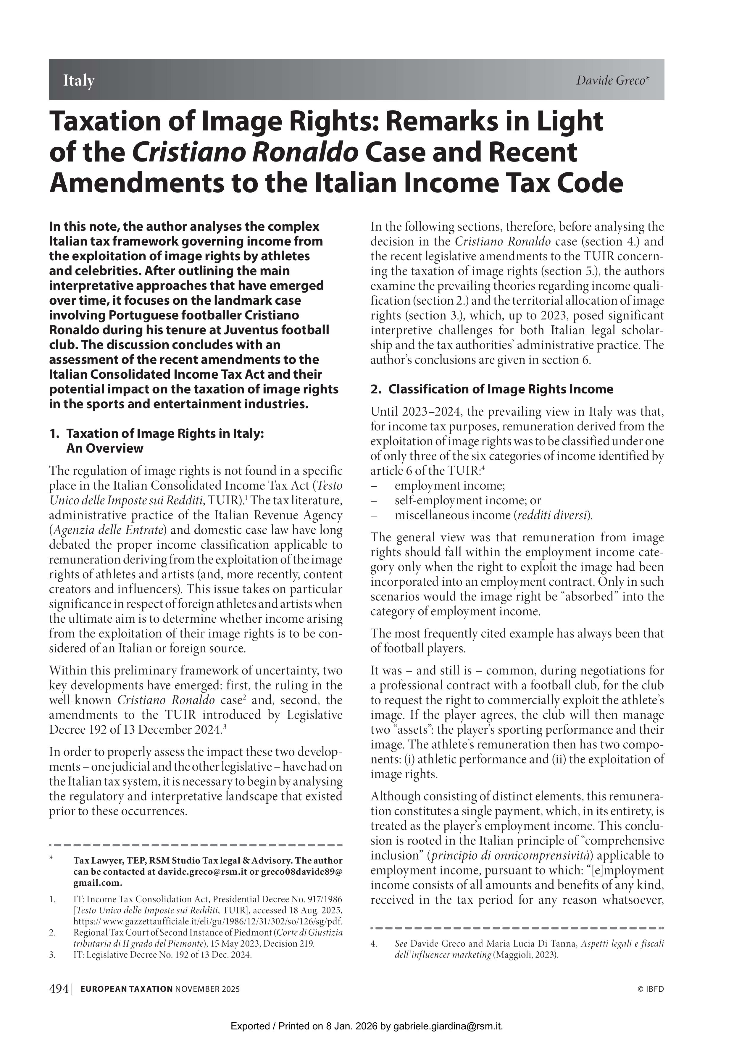 In the following sections, therefore, before analysing the decision in the Cristiano Ronaldo case (section 4.) and the recent legislative amendments to the TUIR concern- ing the taxation of image rights (section 5.), the authors examine the prevailing theories regarding income qualification (section 2.) and the territorial allocation of image rights (section 3.), which, up to 2023, posed significant interpretive challenges for both Italian legal scholar- ship and the tax authorities' administrative practice. The author's conclusions are given in section 6.