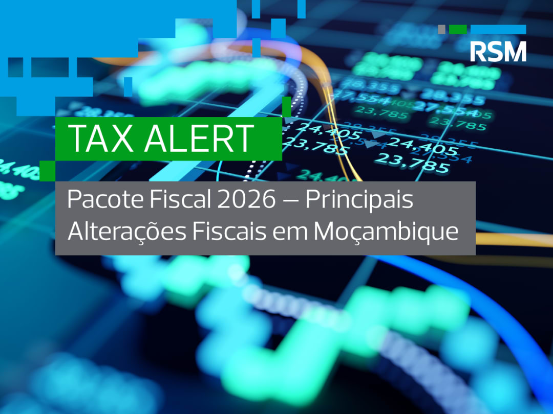 Notícias January 12, 2026 Pacote Fiscal 2026 – Principais Alterações Fiscais em Moçambique READ MORE December 10, 2025 Como garantir sucesso nas operações de M&A em Moçambique sob o novo Código Comercial Read more November 6, 2025 Compliance Fiscal e Contabilístico: Linha de Defesa Contra o Branqueamento de Capitais Read more November 5, 2025 Compliance Societário: A Estrutura Dorsal da Empresa READ MORE October 28, 2025 Avaliar para Transformar: Como as Avaliações Podem Mudar o Futuro dos Projectos Humanitários e de Desenvolvimento READ MORE October 23, 2025 RSM Mozambique 2025 Cyber RI READ MORE Global September 30, 2025 Tax Health Check READ MORE Global August 22, 2025 O futuro da gestão de pessoas começa aqui. READ MORE Global August 22, 2025 Culture, Change & Agility READ MORE