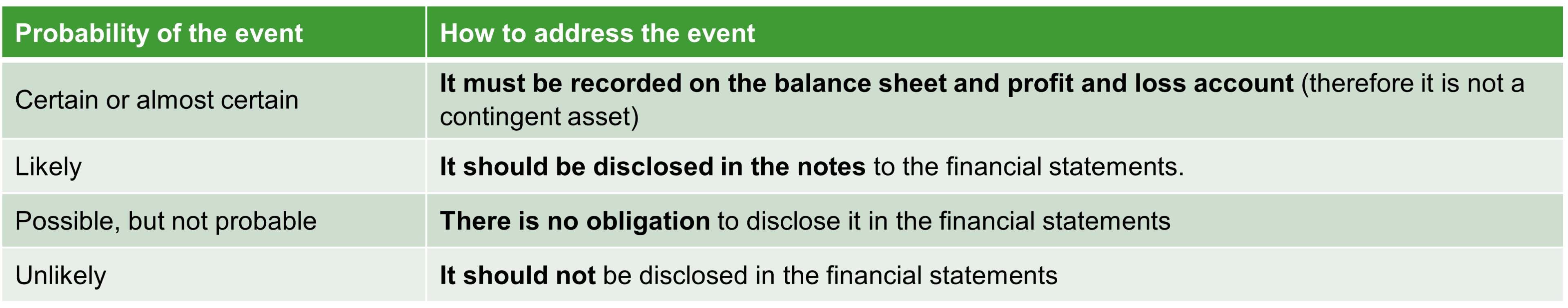 • a possible asset – a contingent asset is not yet a regular asset – it may become one someday, but that may as well never happen; it is worth noting the term “possible” here, as it also refers to the degree of probability,