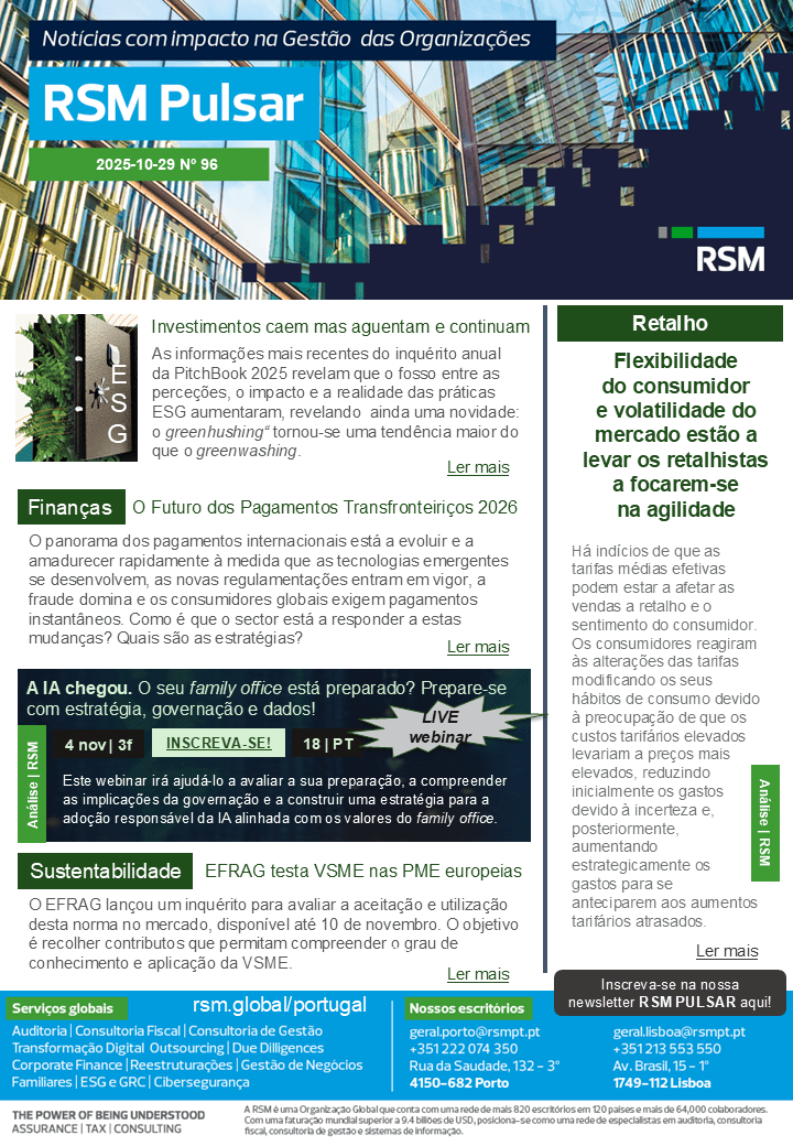 Pulsar Nº 96/2025: Agilidade no Retalho Pulsar Nº 95/2025: Digital Outsourcing Pulsar Nº 94/2025: Otimize a estratégia de Recursos Humanos Pulsar Nº 93/2025: Como as empresas tecnológicas estão a adotar a IA Pulsar Nº 92/2025: Os custos ocultos do “favoritismo” na gestão de projetos Pulsar Nº 91/2025: Como construir uma estratégia de negócio eficaz de IA Pulsar Nº 90/2025: RH - Preparar o amanhã: desenvolvimento e planeamento de competências na era da IA Pulsar Nº 89/2025: Inteligência Artificial - Os humanos ainda compram? As máquinas já estão a tomar decisões? Pulsar Nº 88/2025: Cultura Organizacional é boa para a motivação e negócio Pulsar Nº 87/2025: Reestruturação Estratégica - desenhar para a eficiência de custos e do crescimento escalável Pulsar Nº 86/2025: EFRAG - utilização das normas de reporte ESRS Pulsar Nº 85/2025: "Middle Market" adota IA para impulsionar inovação e eficiência Pulsar Nº 84/2025: Qual o impacto do Omnibus nas médias empresas? Pulsar Nº 83/2025: Cibersegurança - Protegendo a empresa moderna Pulsar Nº 82/2025: RSM Monitor acompanha economia e negócios