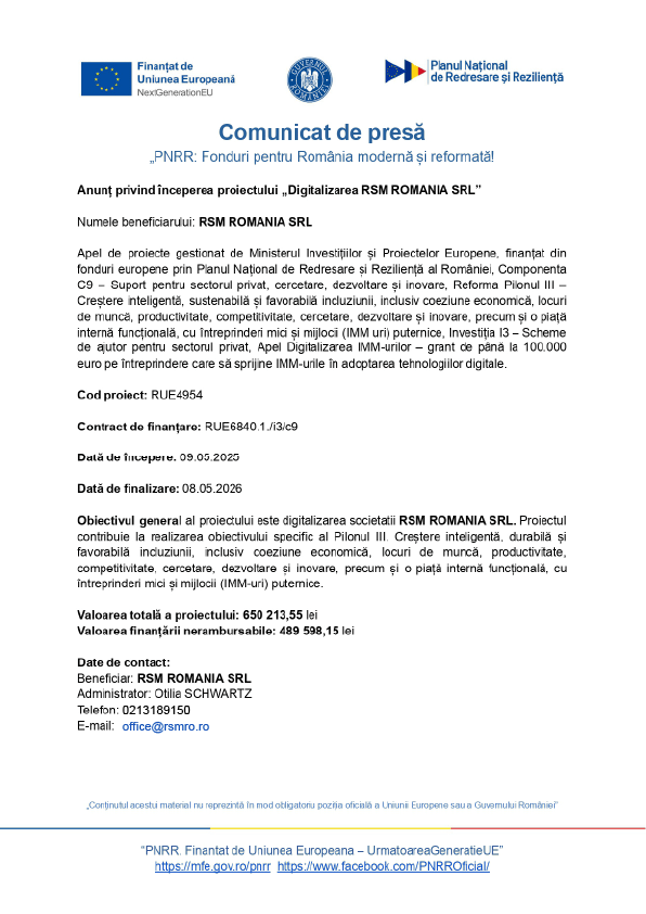 RSM Romania anunță oficial începerea proiectului „Digitalizarea RSM ROMANIA SRL", finanțat prin Planul Național de Redresare și Reziliență al României. Proiectul, în valoare totală de 650.213,55 lei, primește o finanțare nerambursabilă de 489.598,15 lei prin programul dedicat digitalizării întreprinderilor mici și mijlocii.