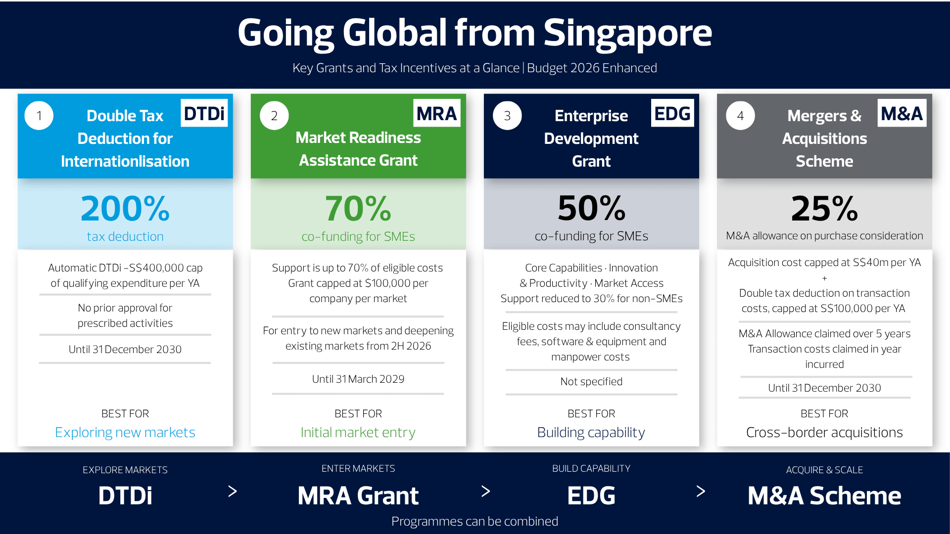 For Singapore companies looking to grow internationally, leveraging these schemes effectively can significantly lower expansion costs, improve investment returns, and reduce execution risk. To summarise: