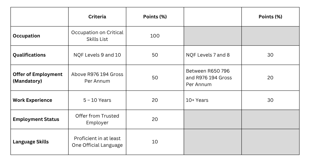 The new points-based system introduces a more transparent and structured way for foreign professionals to assess their eligibility to work in South Africa. The system is based on a scorecard, where applicants acquire points based on various factors such as occupation, qualifications, language proficiency, work experience, and salary level. Applicants will additionally be required to submit valid police clearance certificates and medical reports, and must ensure that they acquire 100 points on the scorecard in order to qualify for either a General Work or Critical Skills Visa.