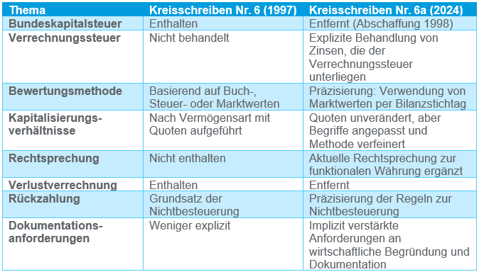 Kreisschreiben 6a bringt wesentliche Klarstellungen und führt wichtige Änderungen bei der Identifikation und steuerlichen Behandlung von verdecktem Eigenkapital ein. Diese Neuerungen haben direkte Auswirkungen auf Schweizer Unternehmen, insbesondere im Hinblick auf konzerninterne Finanzierungen, die Abzugsfähigkeit von Zinsen und Risiken im Bereich der Verrechnungssteuer.