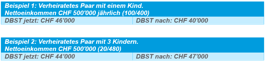 Die Vorlage zielt darauf ab, die DBST in sehr vielen Fällen zu senken, insbesondere für Paare und Familien, bei denen jeder Ehepartner über ein jährliches Nettoeinkommen zwischen CHF 40'000 und CHF 800'000 verfügt.