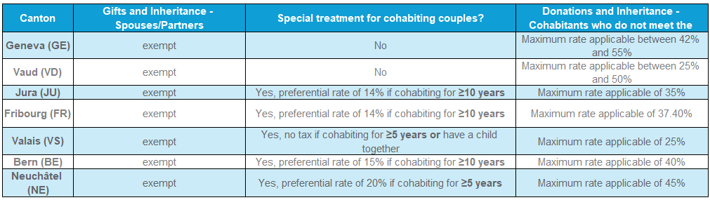 These rules create significant differences between the treatment of married/registered couples and that of cohabiting partners in French-speaking Switzerland. With the Valais exemption from 2025 (subject to conditions), the preferential regimes of Neuchâtel, Fribourg and Jura (subject to proof of cohabitation), and other cantons that tax cohabiting partners as third parties, status, evidence and canton become decisive levers.