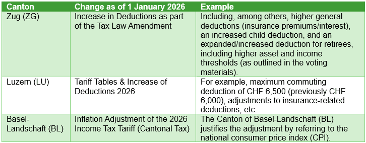 - Pillar 3a (maximum deduction / contribution limit): CHF 7,258 (with 2nd pillar) / CHF 36,288 (without 2nd pillar) – unchanged from 2025