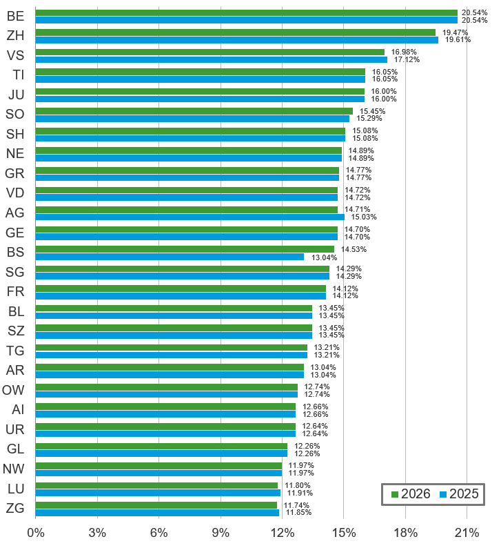 Methodology: The effective tax rate refers to the taxation of corporate profits at the capital city of the respective canton. The rate includes federal, cantonal, and municipal taxes and is calculated based on profit before taxes. If multiple tiered tax rates are published, the highest applicable rate was used. All calculations and information are provided without guarantee. Cantons may adjust tax rates and tax multipliers at any time.